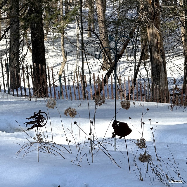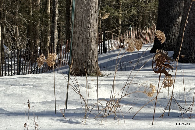 Most of the garden is a sea of snow, an excellent protection from the extreme cold we had in December and January. (Not much above zero for those two months.) But there is some interest thanks to the hydrangeas that Judy of New England Garden and Thread gave me, some black-eyed Susans, and the ornaments I left in the garden.