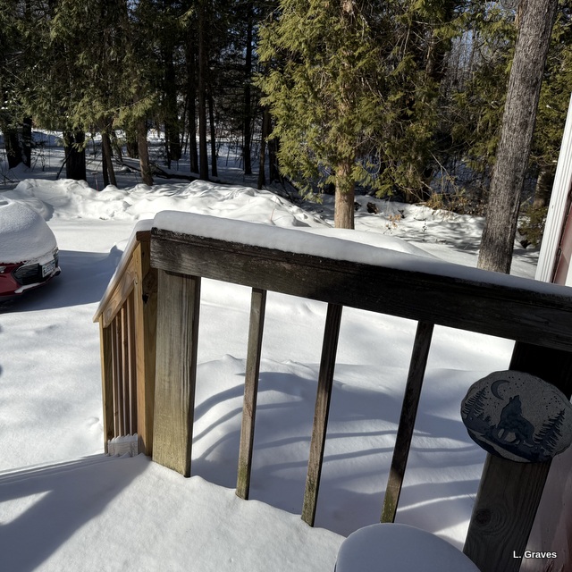 And here is a picture of our porch. The snow on the rail will give an idea of how much snow we got—not much.