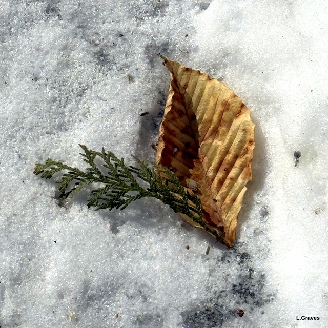 And then one looking down, as I have to do on our icy paths around the house. This time of year, there are always some interesting little tidbits that have blown from the trees surrounding our yard. I did not arrange the leaf and the evergreen sprig. That is nature’s arrangement.