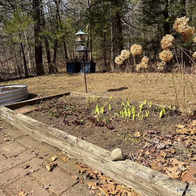 With the snow gone from the yard, it was time for me to dig around my leaf-mulched garden beds to see what was what, and I got quite a little surprise. The perennials have apparently decided that, despite the dusting of snow, spring is here, a good two weeks earlier than it was back in the day. We have lived in this house for forty-two years, and I had developed a routine: raking the backyard as soon as it was dry enough—usually the middle of the month—and by the end of April or the beginning of May, start tending my beds.