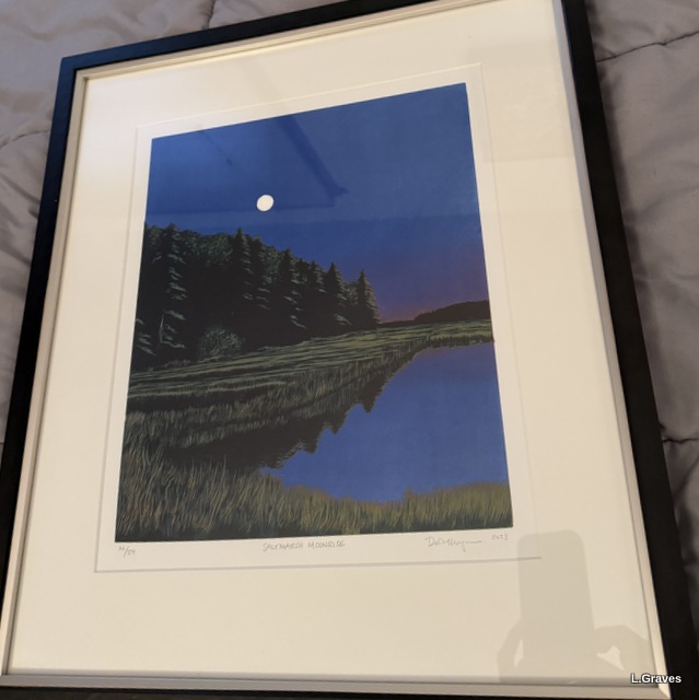 Last week, we met friends for drinks and a bite to eat at the Maine Evergreen Hotel in Augusta, where there is art for sale on every floor. Two weeks ago, our daughter Dee, an art lover extraordinaire, bought two paintings. Last week, she bought a very beautiful print, Saltmarsh Moonrise, by David Morgan.
