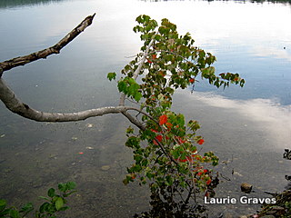 On the Lower Narrows, a cracked branch with some orange leaves dipped over the water.