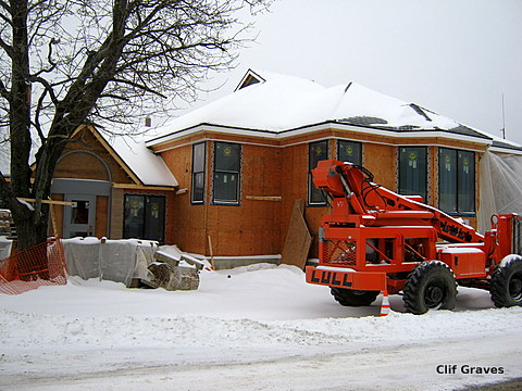 The library expansion is coming along beautifully, and the shell clearly shows just how much the library will be gaining in space. The addition fits right in with the older historic building, and even the siding is a wonderful match. For this we have Phil Locashio to thank, an architect par excellence.