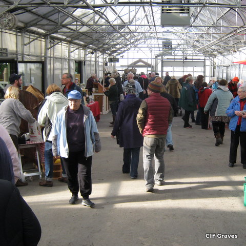 On Saturday, Longfellow’s Greenhouses in Manchester hosted an Eat Local Winter Farmer’s Market. Our own Farmer Kev was there, and Clif and I stopped by just a half hour before closing time. Even so, there was quite a crowd.