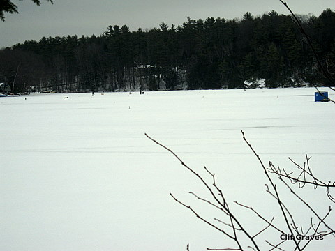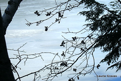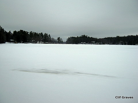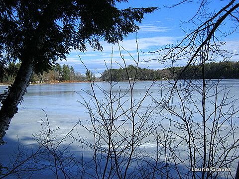 By Monday, the sky had cleared, and the woods were bright with dappled sunlight. On the Narrows, there was a layer of water on the ice, and the fishing shacks were gone. Hauled away, we hope, when it became clear that there would be a lashing rain all day on Sunday. No snowmobiles raced across the the Narrows, and Clif and I could hear the groaning and cracking of the ice.