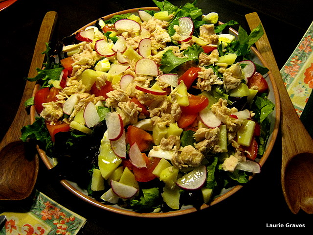 With Farmer Kev’s delectable red and green lettuce, I made a salade niçoise, sort of, using a recipe by the inimitable Mark Bittman as a guideline. My salad niçoise had, along with the lettuce, hard-boiled eggs, sliced radishes, sliced cooked potatoes, sliced tomatoes, and tuna. (Note: Tuna is overfished, and we only eat it once or twice a year on salade niçoise.) I made a homemade vinaigrette to go on the salad. Capers would have been a good addition as would have olives and green beans.