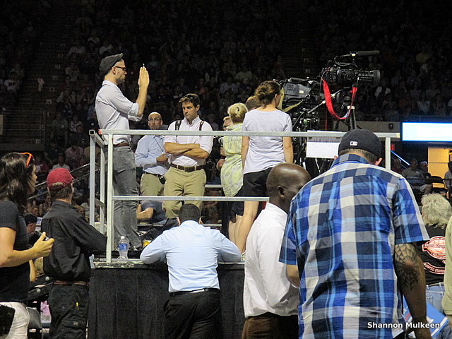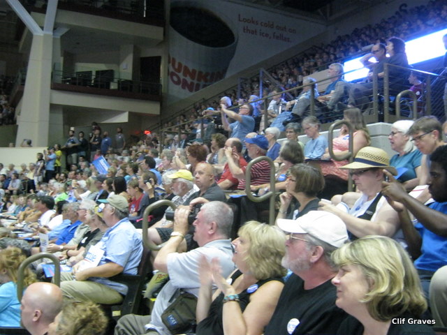 The night was lovely and warm, and the lines were long. As we waited to get in to the Civic Center, the atmosphere had an almost carnival quality to it. A group of men and women, with banjos and guitars, went by playing bluegrass. There were young people with petitions for fair wages and to legalize pot. The crowd was happy and laughing.