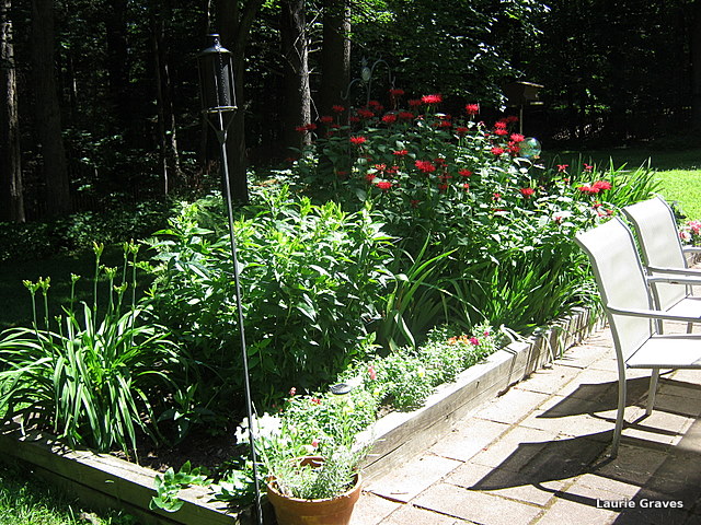 In the backyard, I am happy to report that I learned from my mistakes in the front yard, and the large garden along the patio is indeed a raised bed. There are only six hours of sun in that garden, but I can grow irises, bee balm, and daylilies. Phlox does well, too.