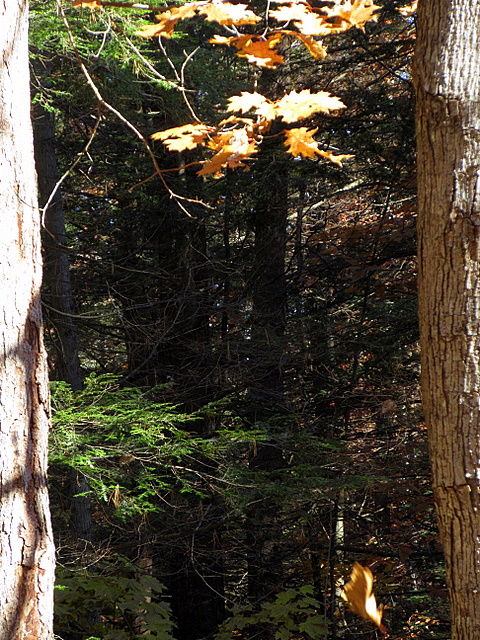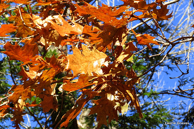 While oak leaves do not have the brilliant color of maple leaves, they have their own quiet beauty, especially when they are against a deep blue sky.