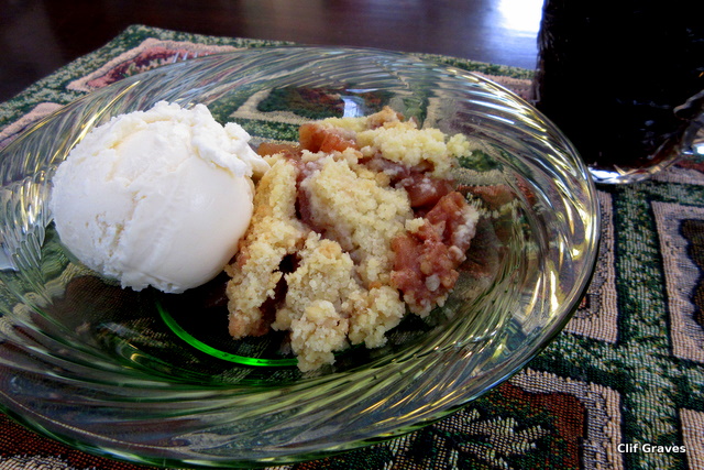 Then there is the smell of apples, cinnamon, and cloves as they blend and bake. It wafts from the kitchen and drifts to the dining room, and I expect this smell stimulates the appetite. (Let’s just say that it’s a good thing I made plenty for seconds.) So you have warm spiced apples and a crunchy, buttery topping. Perfect, right? Almost. It needs a scoop of vanilla ice cream to slowly melt into the warm mixture. Whipped cream is all right, but to my way of thinking, ice cream is the jewel in the crown, so to speak.