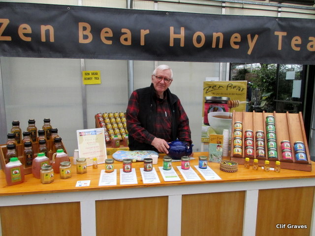 When we were done talking to Farmer Kev, we wandered up and down the mall, looking at the various products. So many good things to sample and see, but we were especially taken with Zen Bear, which sells honey and honey tea. We talked with Frank Ferrel, formerly of Maine Public Broadcasting fame and currently one of the owners of Zen Bear. (He and his wife Lisa run the business.) He told us that the honey comes from Amish farmers in Aroostook County in Maine.