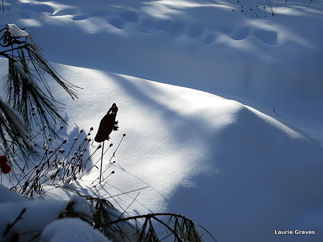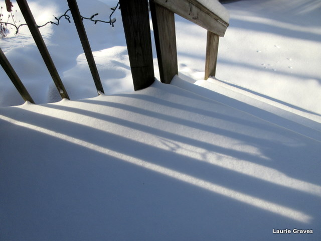 Even now, I do not mind the cold, and because of this, I love and appreciate the look of winter. This morning, after the little storm, our yard was filled with blue shadows and glittering snow.