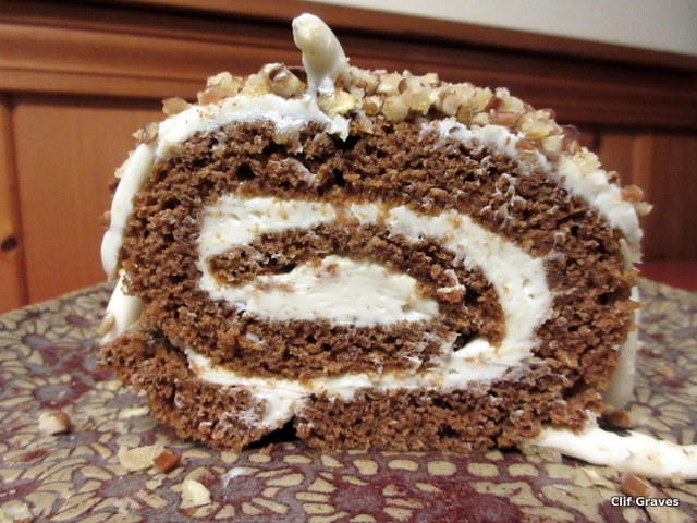 We were more on top of things with the beautiful dessert—a pumpkin roll—that Alice made. As soon I saw that roll, I knew it should have its picture taken.