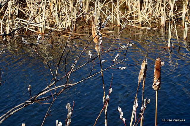 I was taken by the juxtaposition of pussy willows next to frayed cattails.