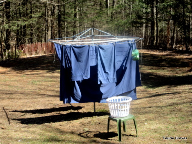 At the little house in the big woods, the excitement just doesn’t end. Yesterday, for the first time this year, I was able to hang laundry on the line. (From December through April, the backyard is in too much shade for the laundry to dry thoroughly.) I must admit that I am a fool for hanging laundry outside, especially in our backyard on a sunny yet windy spring day when the air smells sweet and cold. If I could bottle that smell, I’d be a rich woman.