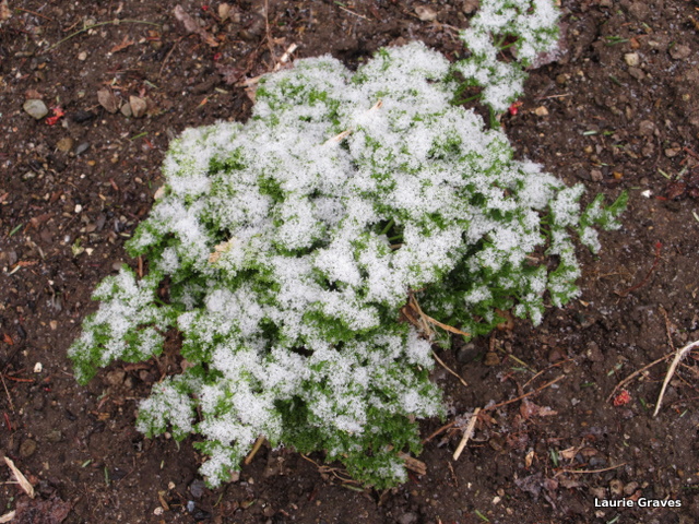 Today, on April 26—the anniversary of my mother-in-law’s birthday (1918) and the town of Winthrop’s incorporation (1771)—at 11:00 a.m., I looked out the window to my backyard. And what should I spy? Snow, snow, and snow. Enough to get my hair wet as I took a picture of the patio table. Enough to frost the herbs and trees.