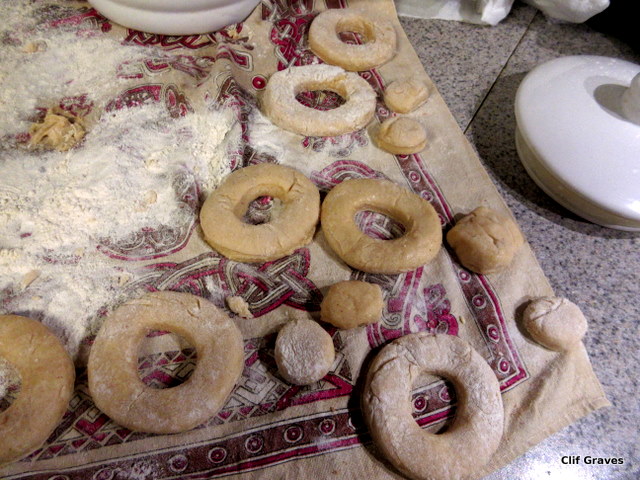 Then, it was on to donuts, and while it wasn’t exactly a disaster, we did have a few difficulties, the first being that I didn’t read the directions thoroughly. I dumped all the flour in the bowl at once, and this made it difficult for my little hand mixer to mix the dough properly. But the biggest kerfuffle was that the dough was too sticky for the donut cutters, and the dough stuck stubbornly inside the cutters.