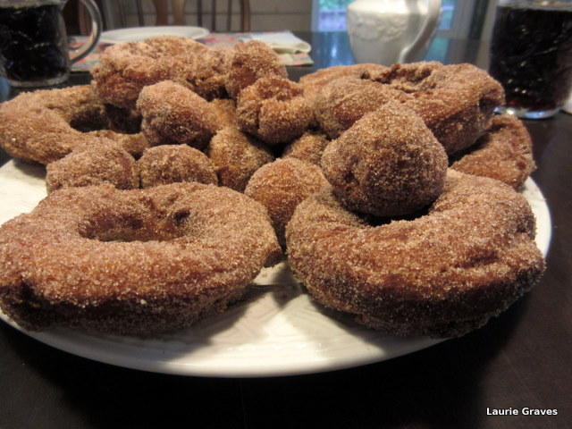 When we were done, we had two fine plates of donuts, and we settled around the dining room table with coffee and tea to go with the donuts.