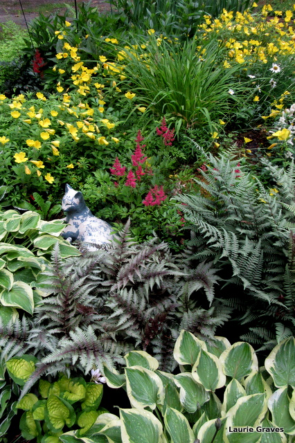 You had your lucky day then, with an insect and a bird. Nice captures. The hostas look impressive indeed and they go well with the ferns. I love the cat in the middle (it is a cat, isn’t it?).
