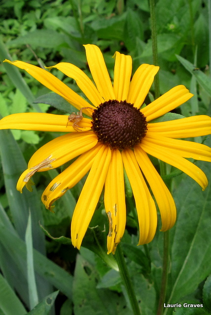 Less showy but much appreciated are the black-eyed Susans, and sometimes I even catch a little inhabitant of the garden.