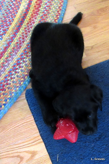 The minute I saw him, I fell in love. We brought Magic a toy, as we would any new baby, and he immediately started chewing on it with a vengeance. When Magic was done with the toy, he allowed me to cuddle him, and already he has the open, affectionate nature so common to black Labs.