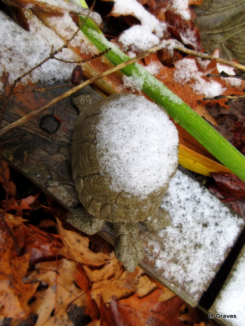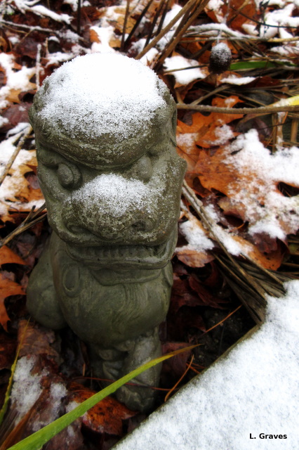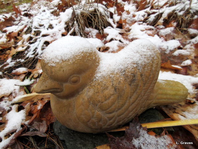 I so enjoy taking pictures of garden ornaments with a dusting of snow. They look solemn and stoic, and it appeals to my New England sensibility.