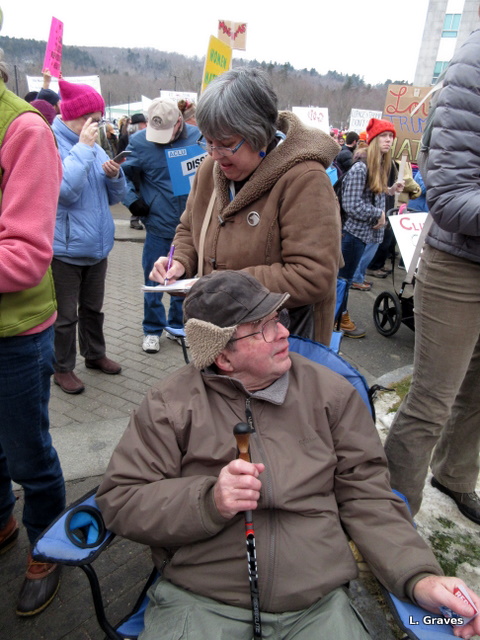 Even though the past two months have been grim for progressives, the mood at the Augusta, Maine, march was anything but gloomy. Instead, there was an almost festive air at the gathering at the State Capital. Judy observed that there were lots of happy faces, and Clif noted that the event had a Common Ground Country Fair feeling.