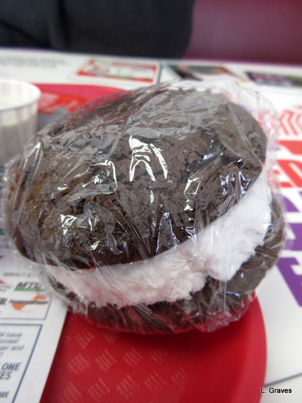Thanks, Jason! A whoopie pie is two little chocolate cakes held together with cream to make one ball of deliciousness. If you ever come to Maine…