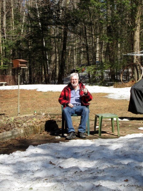 But what a difference a week makes in Maine. Yesterday, here is what the patio looked like. The weather was so warm that Clif didn’t even need to zip his jacket.