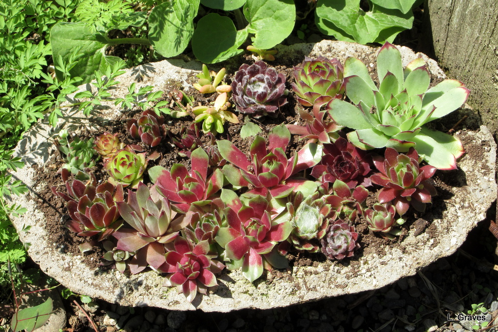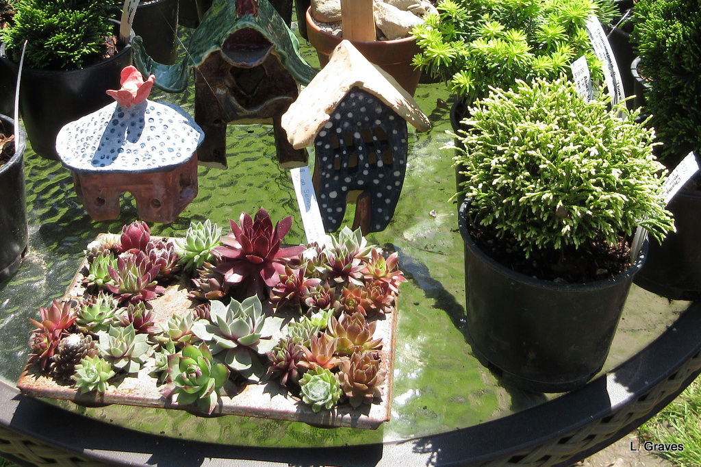 Denise and Rick have what can only be called a flair for making their nursery a lovely place. Green, green, and green, so bright yet soothing. Lots of little containers tucked with different varieties of hens and chicks. Double-blossom white trilliums. Arresting sculpture.