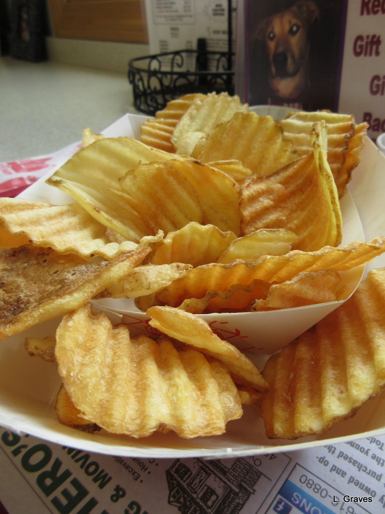 On Saturday’s trip to the Red Barn, we had mixed veggies—I guess we can’t totally get away from our plant-based diet—and homemade chips. Oh my, they were good.