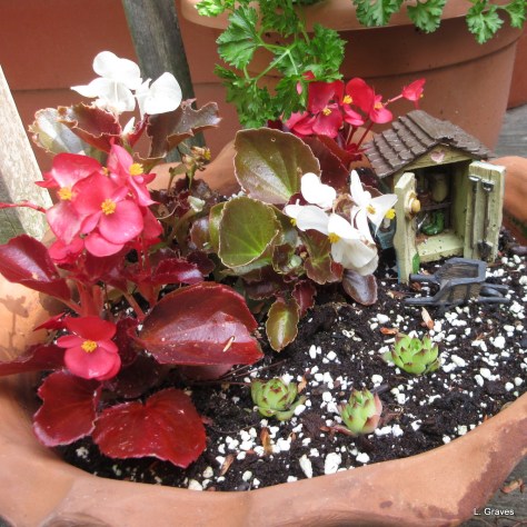 Second, on a much lighter note. I have a fondness for cute little things, for knickknacks and garden ornaments and various other folderol. Mostly I keep this in check, but a couple of weeks ago I went to D. R. Struck Landscape Nursery and succumbed, coming home with a wee garden shed and a diminutive wheel barrow. I found a shallow pot, planted some begonias and few tiny hens and chicks, and voilà! A little scene to great me every time I come up the steps. And I must admit, it pleases me very much to see it.