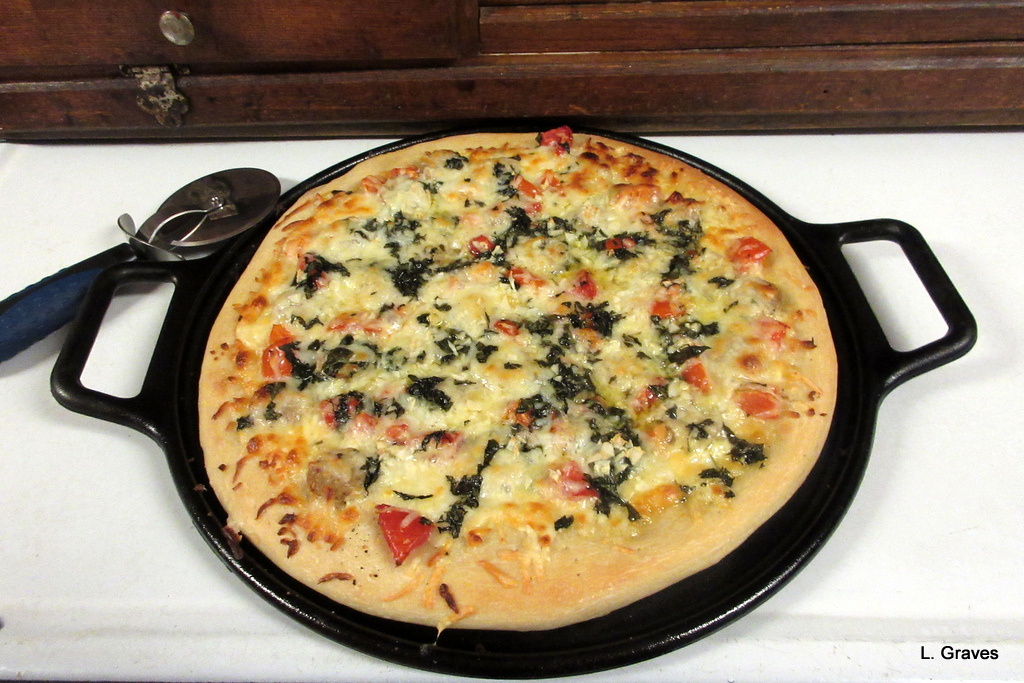 An absolutely scrummy pizza we made with Portland Pie pizza dough, available at our local supermarket; tomatoes from my garden; basil and garlic from Farmer Kev’s; Cabot’s cheddar cheese; mozzarella; chicken sausage; and olive oil. Clif put it all together, and oh my, was it good.