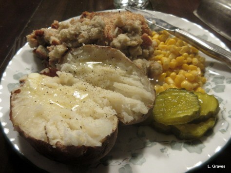 But I could tell he was a little sad, and last night we had a quasi-Thanksgiving dinner of breaded chicken thighs, baked potatoes, corn, and stuffing from a bag. It was pretty darned good, and a snap compared with the real event. Clif’s desire for stuffing was satisfied, and clean-up was no problem at all.