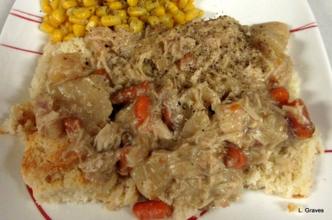 Now on to biscuits. Somehow, cold weather encourages baking, and last night’s supper was a classic—biscuits with gravy. The previous night, in a crock-pot, I had cooked a chicken with potatoes and carrots. With the resulting stock, I made a gravy—two cups stock, 4 tablespoons butter, 4 tablespoons flour—and then added the leftover chicken and vegetables. The stock was so tasty from the spicing—garlic, salt, pepper, sage, thyme—I used for the chicken that no additional flavoring was necessary.
