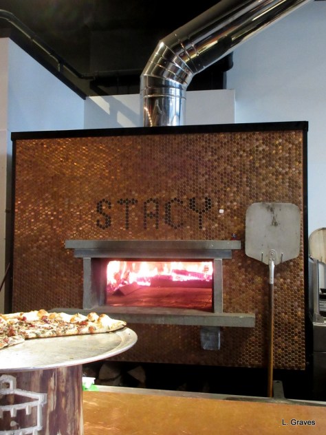 After Clif and I were done eating, we went to look at the pizza oven, and I was allowed to take pictures of it. The oven has a name—Stacy—in honor of this building’s previous store, a tempting gift shop where I have bought many things.