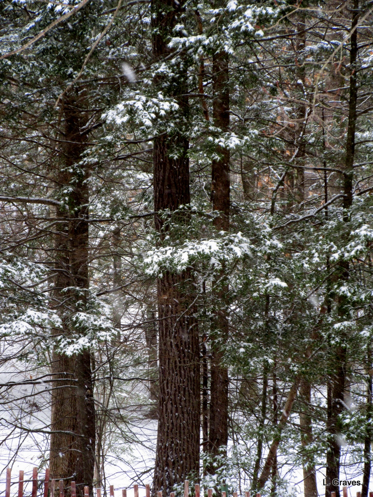 Finally, here is a shot of the cool, green, mysterious forest that begins at the edge of our yard. While I love the colors of spring, summer, and fall, I also am taken with the muted colors of winter. I find them restful, soothing even. To me, winter is a welcome respite from the joyous burst of life—birth, growth, and preparation—that the other seasons bring.