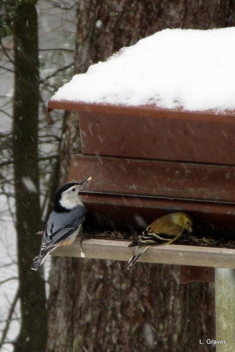 Here is a picture of a nuthatch and a goldfinch. The nuthatch appears to have a seed in its beak, and I love the black dot of the eye set in white. If you look closely, you will notice a fizz of snow going across the feeder. Yes, it was spitting snow again, but it is after all February in Maine, which means that we are only halfway through winter.