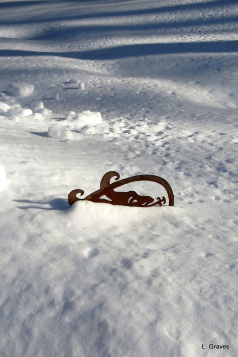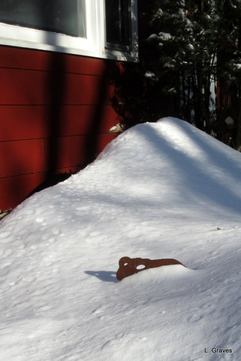 On the other side of our driveway is our small front yard. Last fall, I left a few of the sturdier ornaments in the garden, and there they were, just peeking over the deep snow.