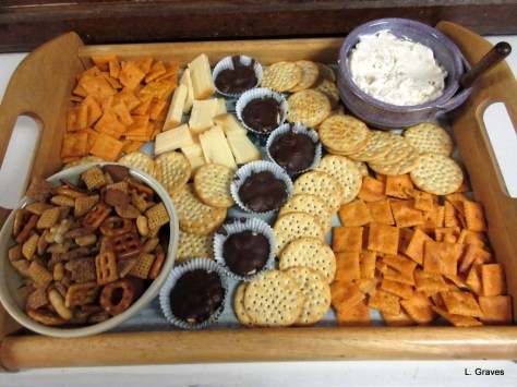 Before the Super Bowl, on Facebook , I had discovered an idea for serving snacks. I was so taken with the way the food looked that I decided to try it for this gathering. Really, the idea couldn’t be more simple—array an assortment of snacks on a tray—and here is what I did.