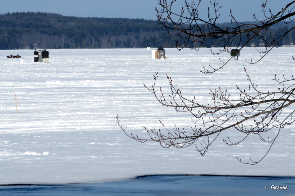 Even though it was warm, and there was open water by the shores, there were still plenty of ice-fishing shacks on the mostly frozen lake.