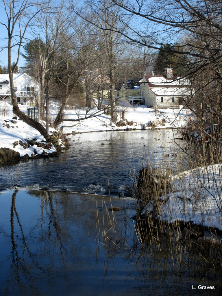 On the road by the lake, there’s a little bridge, plain and nowhere near as lovely as you would find, say, in Scotland. But if you cross the road, stand on the bridge, and look toward town, you will see a pleasing tableau, a classic New England scene.