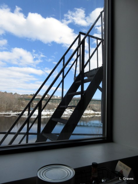 Now back to pizza. When Clif and I go to Cushnoc, we want to sit by a window that overlooks the Kennebec, and for some reason, I really like the juxtaposition of the fire escape with the river.
