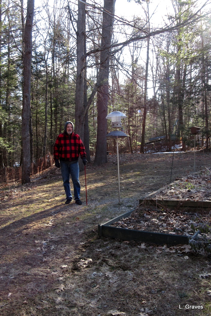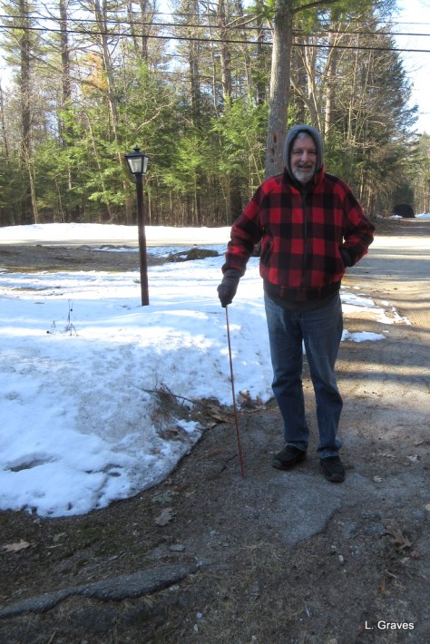 Now, back to Narrows Pond Road with a ta-dah! The snow is nearly all gone from the backyard, and thus Snow-gauge Clif’s job there is done. Not enough snow to worry about. In fact, it’s time to think about raking.