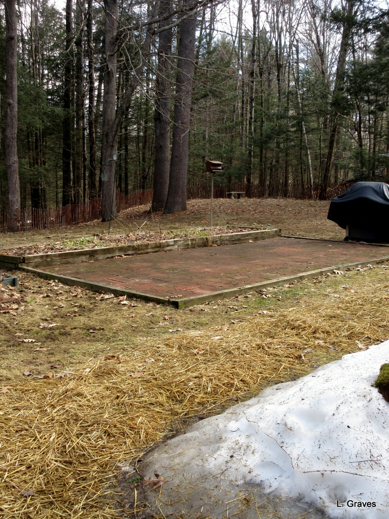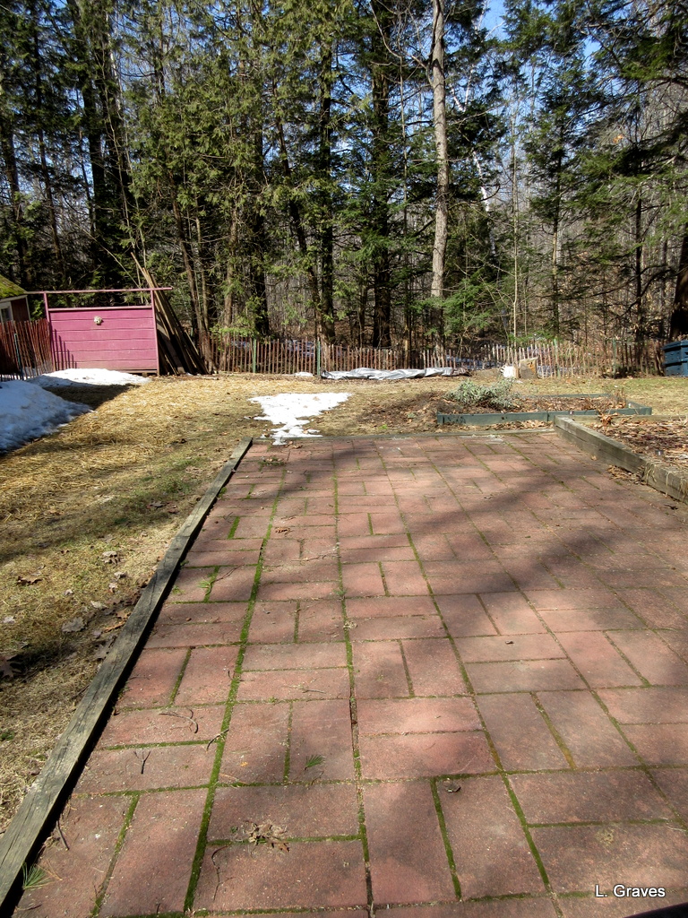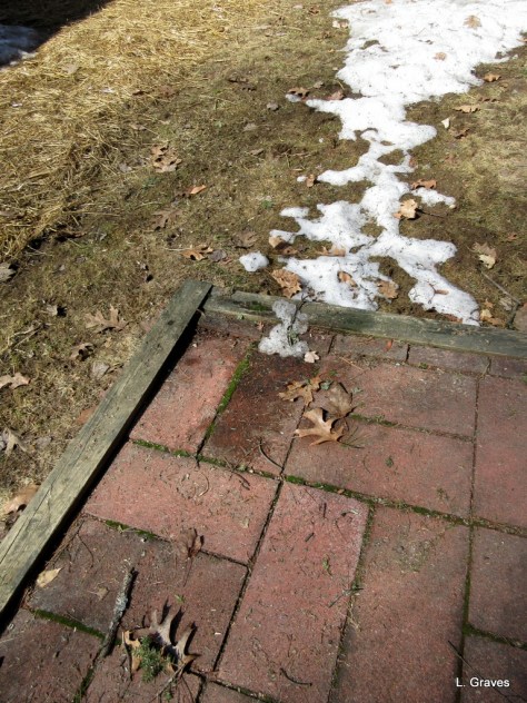 Stubborn or not, that patch’s days were numbered, and by late afternoon, the snow was gone, baby, gone. Note the hay on the walk rimmed with snow. No, our yard is not totally snow free, but it sure is good to see the patio once again.