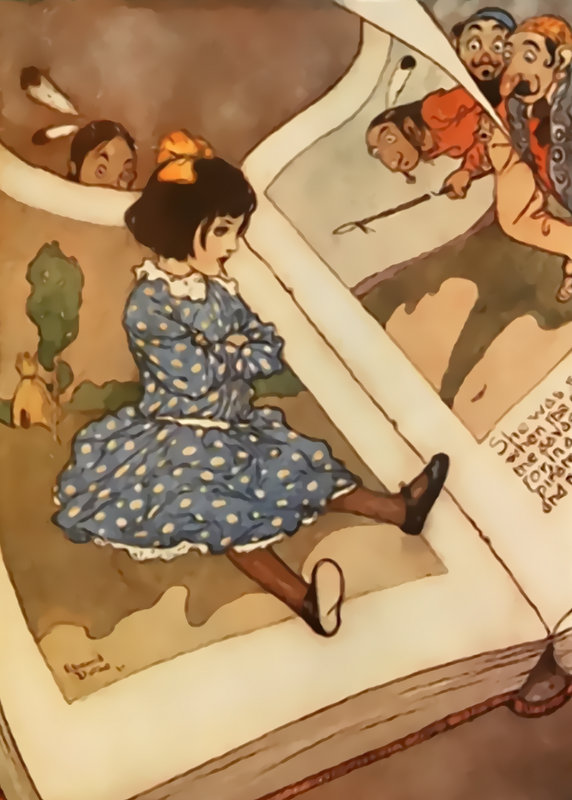 This is one of my favorites. The illustrator is Edmund Dulac, and the picture is from the story “A Little Girl in a Book,” written by Mrs. Rodolph Stawell. Funny to think there was a time when women writers went by their husband’s name, but there you are. Progress has definitely been made on that front.