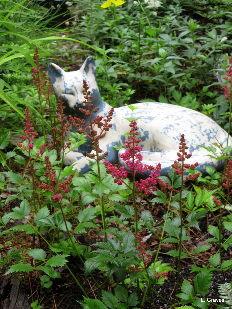 What a feast for heat-sore eyes! Those lilies are divinely fabulous. What a colour. And I really like your blue fountain.and the astilbe. And the stone cat. But I could really bite into that ice cream cake right now. We’ve been having hot weather too.