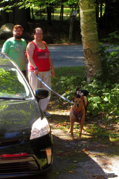 Behind our house, there are trails in the cool, green woods, and this morning Shannon and Mike took Holly and Somara there for a walk, where they could both run off-leash. Here they are coming back from their romp.