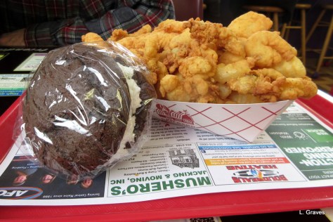 It’s not every day that you get the first shipment of your new book. Therefore, when the box with copies of Library Lost came in, Clif and I decided to celebrate and go to the Red Barn for some of their delectable seafood and, of course, a whoopie pie. So good and so reasonably priced.
