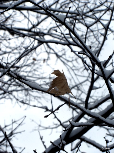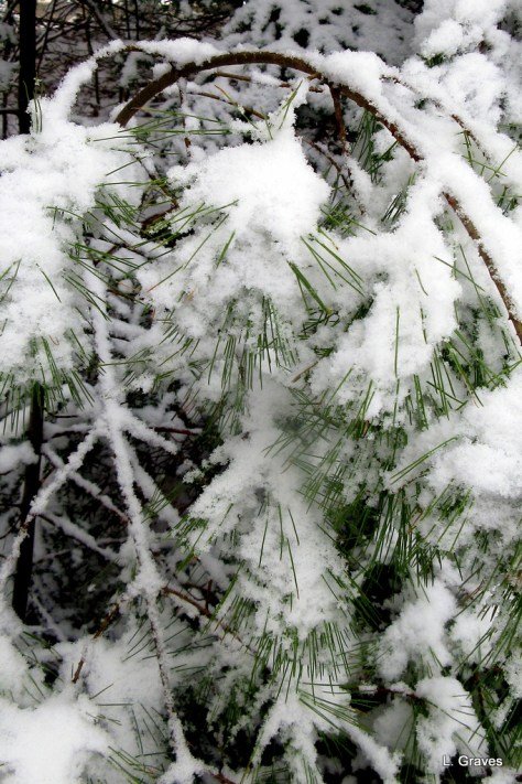 A lot of it depends on light. Snow has a tendency to “blow out” when photographed, which produces a sort of haze. More advanced cameras than mine have settings that help deal with the problem. My wee camera isn’t that sophisticated, so I have to really watch the light. Snow also can have a blue tint, which I rather like, but to get a whiter tone, the white balance has to be adjusted. There. End of photography lesson.